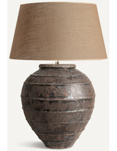 Bordlampe udført i et design, fremstillet af rustik brun keramik og med skærm i naturfarvet jute. Lampen måler 105 cm i højden og med skærmdiameter på 55 cm. Afbryder findes på 105 cm ledning. Forventet leveringstid: Tillad op til 5 ugerBordlampe udf