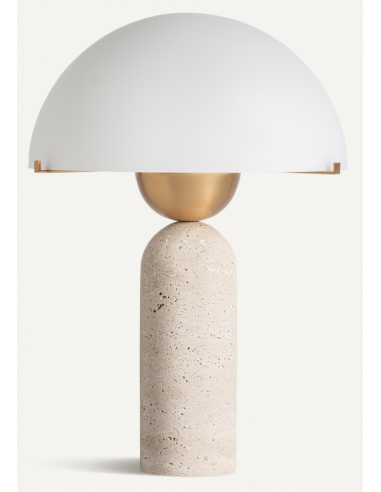 Bordlampe udført i et design, fremstillet af travertin med detaljer i antik bronzelakeret metal og med skærm i hvid glas. Lampen måler 44 cm i højden og med skærmdiameter på 30 cm. Afbryder findes på 180 cm ledning. Forventet leveringstid: Tillad op til