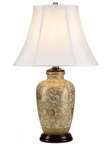 Goth Thistle bordlampe udført i et amerikansk design. Lampen måler 58 cm i højden og 32 cm i diameter og leveres til europæisk standard til 1 x E27 lyskilde. Lampen er udført i krakeleret guld- og cremefarvet porcelæn og med skærm i hvid polyester. Forv