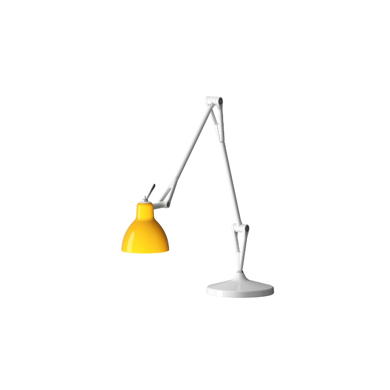 Luxy T1 bordlampe fra Rotaliana Skærmen er i glas og er malet på indersiden af glasset, det giver en smuk dybde i glasset. Skærmen fås i følgende farver: Blank hvid, satin hvid, rød, gul eller sort. Stellet er af aluminium og fås i enten mat sort, blank h