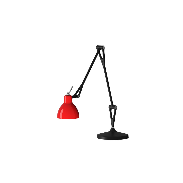 Luxy T1 bordlampe fra Rotaliana Skærmen er i glas og er malet på indersiden af glasset, det giver en smuk dybde i glasset. Skærmen fås i følgende farver: Blank hvid, satin hvid, rød, gul eller sort. Stellet er af aluminium og fås i enten mat sort, blank h