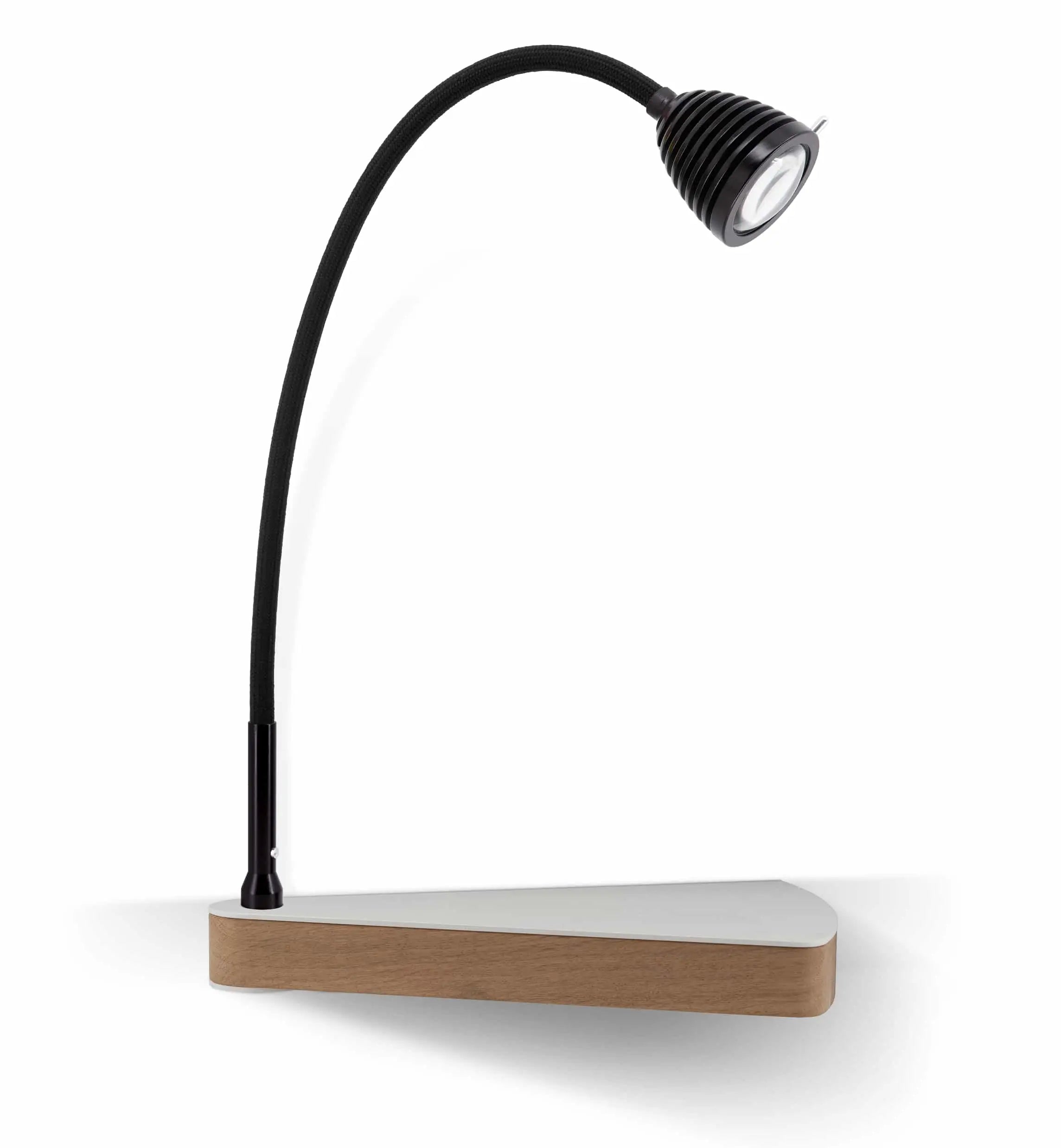 Dr. Wattson væglampe Less N More Dr. Wattson væglampe. Super lækker gennemført LED lampe i rå aluminium og med et lille sidebord i aluminium med skjult skuffe i massivt egetræ. LEDen er 7,5W og med en god farve i lyset 2700K CRI 95 og dæmpbar. Med et let