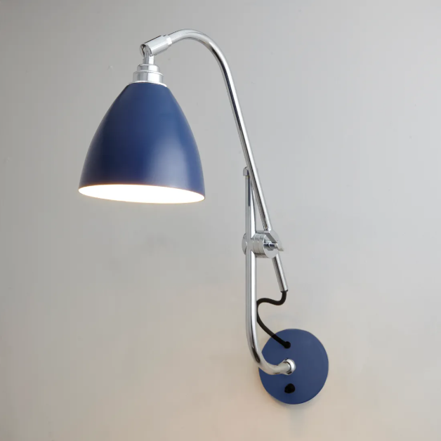 Task væglampe Original BTC. Den klassiske britiske væglampe med krom stel og de 8 forskellige farvede skærme. Skærm farver i sort, blå, hvid , creme, oliven grøn, grå, rød. Lyset er fremadrette og justerbart da armen kan køres opned på fast arm og selve