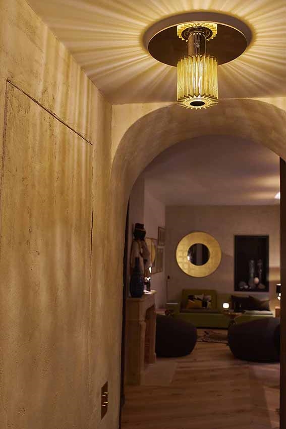 In The Sun 270 væglampeloftlampe, guld fra DCW ditions – designet af Dominique Perrault Galle Lauriot-Prvost. In The Sun blev designet til renovationen af Pavillion Dufour ved Chateau de Versailles. Perrault og Lauriot-Prvost ville skabe en hyld