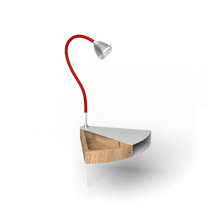 Dr. Wattson væglampe Less N More Dr. Wattson væglampe. Super lækker gennemført LED lampe i rå aluminium og med et lille sidebord i aluminium med skjult skuffe i massivt egetræ. LEDen er 7,5W og med en god farve i lyset 2700K CRI 95 og dæmpbar. Med et let