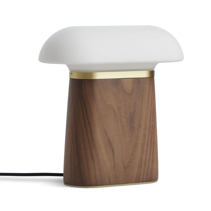 Bordlampe i valnød og mat glas med lysdæmper Flot og elegant bordlampe fra danske WOUD. Lampen er udført i en base af valnøddefiner, samt en lampeskærm i mat glas. De to dele mødes ved en elegant guldstribe af messing. Lampen måler 27 cm x 13 cm x 27,5 cm